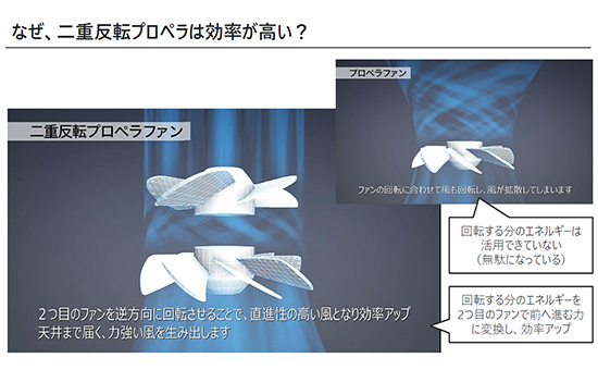 吹き出し口に2枚のプロペラファンを設けて、それぞれが逆方向に回転する。これは航空機のプロペラや船舶のスクリューで使われている技術で、無駄なエネルギーの発生を抑えて、効率よく風を発生させる。1枚だとプロペラの回転に合わせて風も回転して分散してしまうが、2枚目のファンを逆方向に回転させることで直進性が増し、天井まで力強い風が届くようになる。