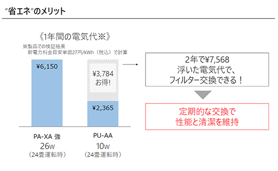 同社の従来機種「PA-XA」の強運転時の26Wの電気代と比較すると、年間で3784円の得になる。高性能フィルターは税別7000円なので、交換目安の2年なら7568円の浮いた電気代で交換できる計算だ。そもそも半年や1年で交換するケースが多い一般的な空気清浄機のフィルターと比べても、メンテナンス料は低く抑えられている。