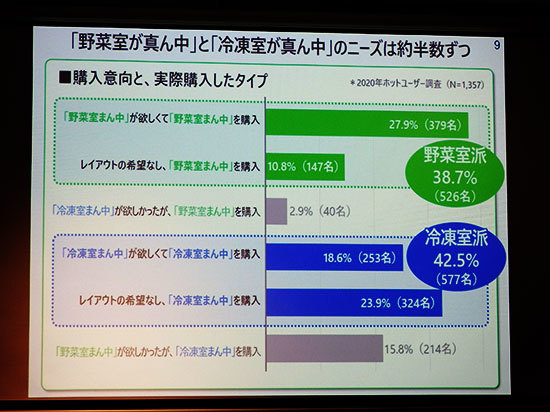 パナソニックの調査では、真ん中にレイアウトするのは野菜室と冷凍室でニーズが拮抗している。最初から選んで購入した人と、結果的に購入した人を合算すると、野菜室派が38.7%、冷凍室派が42.5%という結果だった。