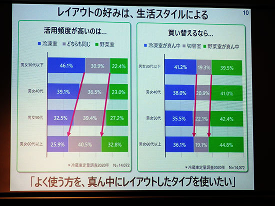 そして、もう一つの調査では、年齢や生活スタイルの変化によってレイアウトの好みが変わることを示している。30歳以下の若い人ほど冷凍室の活用頻度は高く、逆に60代以上になると野菜室の活用頻度が増えてくる。次の買い替えニーズでも、年齢が高くなるほど、野菜室のニーズが高まる。