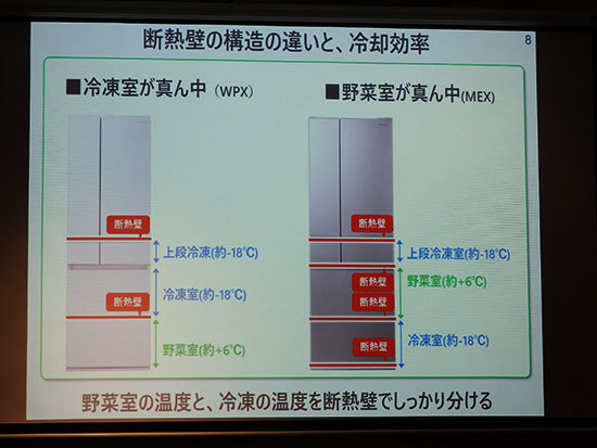 F516MEXの容量が37Lほど小さくなってしまうのは、約6℃の野菜室の上下を製氷室や冷凍室でサンドイッチのように挟むため、断熱壁が増えるからだ。野菜室の背面には、冷却器の熱を遮断する断熱壁もある。