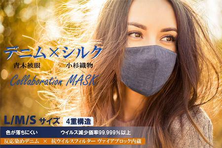 デニム×シルクマスクは、表地に青木被服のデニム生地を、裏地に小杉織物のシルク生地を使用。デニム生地は、糸の段階から染料を浸透させ色合いを保持する「反応染め」と呼ばれる特別な染色方法で織られたもので、何度洗ってもほとんど色落ちがしないのが特徴となる。染色に地元の小田川の上質な水を使用することで、滑らかな色合いときめ細やかな質感に仕上げている。