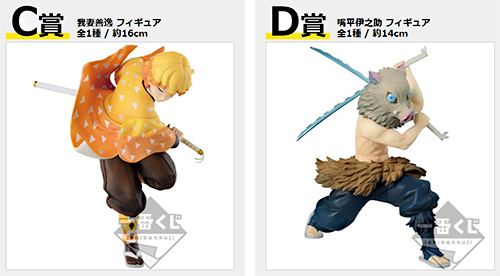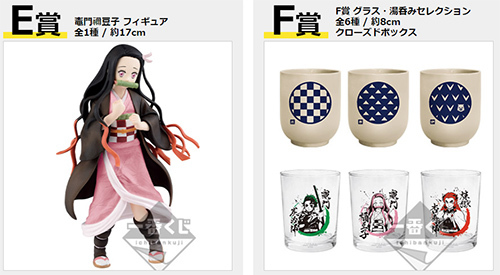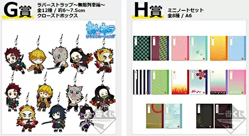 くじの賞品は次の通り。A賞「煉獄杏寿郎 フィギュア」(約20cm)、B賞「竈門炭治郎 フィギュア」(約18cm)、C賞「我妻善逸 フィギュア」(約16cm)、D賞「嘴平伊之助 フィギュア」(約14cm)、E賞「竈門禰豆子 フィギュア」(約17cm)、F賞「グラス・湯呑みセレクション」(全6種/約8cm)、クローズドのG賞「ラバーストラップ~無限列車編~」(全12種/約6~7.5cm)、H賞「ミニノートセット」(全8種/A6)、クローズドのI賞「ちょこのっこフィギュア~うたた寝ver.~」(全6種/約4cm)、ラストワン賞「ラストワンver. 煉獄杏寿郎 フィギュア」(約20cm)。