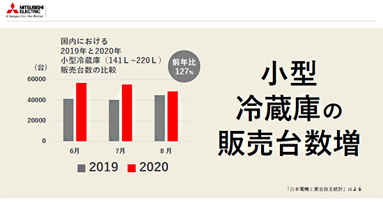 コロナ禍で小型冷蔵庫(141~220L)の販売台数が伸びている。日本電機工業会(JEMA)の自主統計データでは、2020年6~8月で前年同期比127%と増加している。