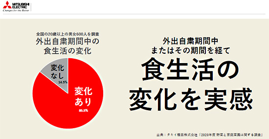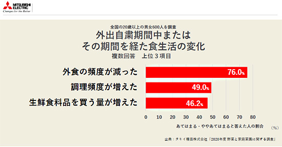 背景には食生活の変化がある。全国20歳以上の男女600人を対象にした外出自粛期間中の食生活の変化に関するアンケートでは、「変化あり」と回答した人が85.5%に上った。複数回答による上位3項目の内訳は、「外食の頻度が減った」が76.0%、「調理頻度が増えた」が49.0%、「生鮮食品を買う量が増えた」が46.2%と、いずれも自炊する機会が増えていることがわかる。