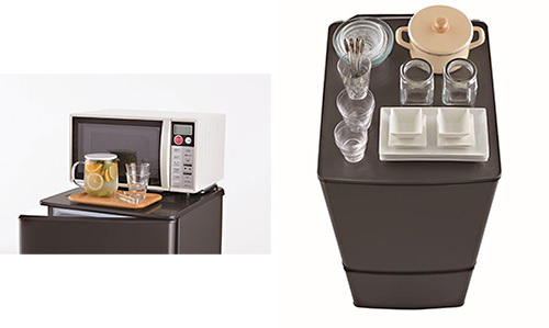 単身世帯の場合、冷蔵庫の上に電子レンジやトースターなどを載せて使うことが多い。そこで、電子レンジと冷蔵庫の扉の間のスペースを拡張することで、食品や食器の一時置きができるようにしたのだ。冷蔵庫から取り出した飲み物を、その場でサクッと注ぐ際も便利。もちろん、電子レンジなどを載せなければ多くの食器を置くことができる。