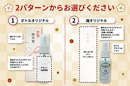 御年賀用アルコールでは、ボトルラベル、または外箱をオリジナルデザインで作成することが可能。新年を機に、時代に沿ったギフトを贈ることで企業ブランディングに活用できる。