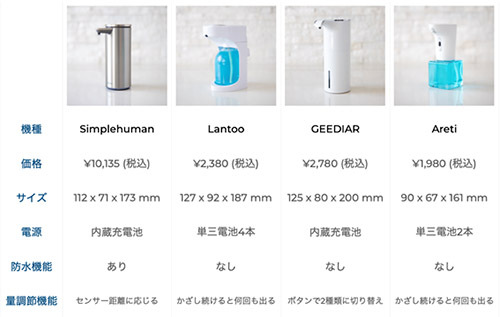 このほかに気になった点は泡の量調節機能だ。ラントゥーとアレティは1回の量が決まっており、かざし続けることで量を増やす。一方、シンプルヒューマンとギーディアーは1回に出てくる量を調整できる。どちらも量が調整できるのは同じだが、前者は2回出すのに数秒かざし続ける必要があり、毎日使っていると面倒に思えてくる。少量ずつ使いたいなら問題ないかもしれないが、そうでない場合は量調整機能の有無を確認して機種を決めるといいだろう。