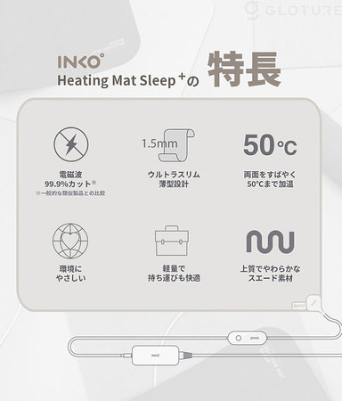 Glotureは、超薄型ヒーター「INKO Heating Mat Sleep+」を自社ECサイト「GLOTURE.JP」で12月25日に販売開始した。税別価格は8900円。