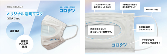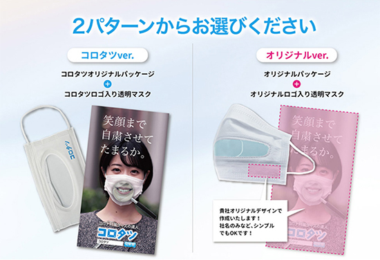 マスクは1枚ずつ個包装されており、パッケージがコロタツオリジナル台紙で「コロタツ」のロゴ入りのものと、オリジナルの台紙とロゴ入りのものを選ぶことが可能。オリジナルバージョンは、パッケージや本体に自社のロゴを印刷して社員へ配布したり、ノベルティなどにも活用できる。