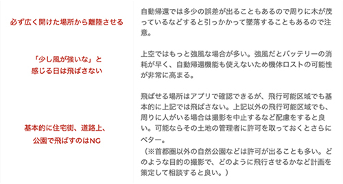 ここまで入門者にも優しいと書いてきたが、当然どこでも飛ばしていいわけではないし、安全に飛ばすためには押さえておかなければいけない点もある。下記は200g未満の航空法適用外機体でも最低限押さえておきたい事項だ。可能であれば国交省のウェブサイトにあるドローンに適用される航空法も頭に入れておきたい。