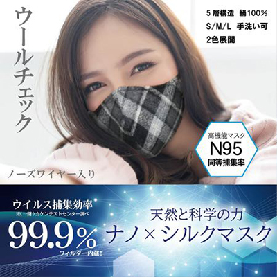 小杉織物は、ウイルス捕集効率をもつ「Zettaナノファイバーフィルター」を内蔵した絹マスク「ナノ×シルクマスク」の表生地にチェック柄のウール素材を採用したファッションマスクの販売を公式サイト「Itokala by 小杉織物」で開始した。