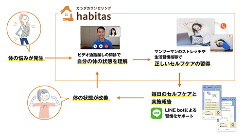 カラダカウンセリングhabitasは、誰でも気軽に手持ちのスマートフォンやPCから参加可能で、ビデオ通話のZoomを通して、体の専門家である理学療法士に自分の体の状態に合ったストレッチ・生活習慣の指導を受けることができる。30~60代の女性をメインターゲットとしており、悩みを抱えた人に幅広く利用してもらうため、初回施術は無料で提供する。