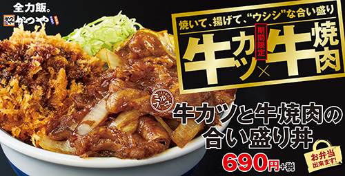 税別価格は、「牛カツと牛焼肉の合い盛り丼」が690円、「牛カツと牛焼肉の合い盛り定食」が790円、「牛カツと牛焼肉の合い盛り単品」が590円。