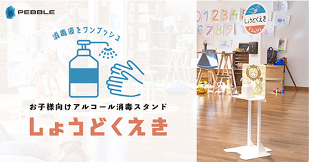ウイルス感染症対策の製品・サービスを提供するペブルコーポレーションは、子どもが使いやすい高さに消毒液を設置できるアルコール消毒スタンド「しょうどくえき」の予約販売を開始した。税別の価格は3万9800円。