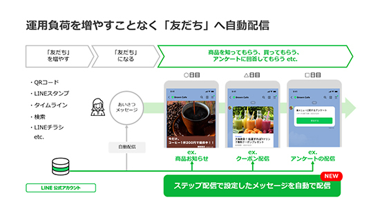 LINEは、同社が提供する企業・店舗向けLINEアカウント「LINE公式アカウント」で、「友だち」追加を開始条件に自動でメッセージ配信ができる新たな機能「ステップ配信」の提供を開始した。