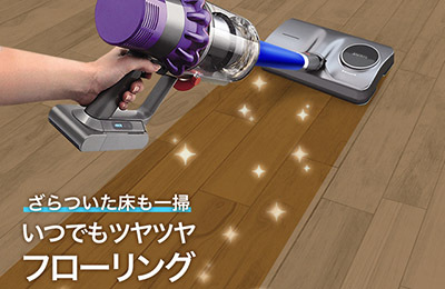 マルチウォーターモップは、ダイソン掃除機専用の多機能ヘッド。ダイソン掃除機の吸引力はそのままに、「吸引」「乾拭き」「水拭き」掃除を同時に行うため、食べこぼしや頑固な汚れ、床のベタつきまで拭き取ることが可能。これまで面倒だった雑巾での水拭きを、マルチウォーターモップで簡単に行うことができる。