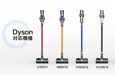 マルチウォーターモップを接続可能なダイソン掃除機は、「V7/SV11」「V8/SV10」「V10/SV12」「V11/SV14」の各シリーズ。普段使用しているダイソン掃除機に簡単に取付けることができ、掃除機本体の電源ボタンを押すと自動でスタートする。