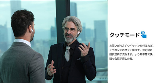 タイムケトルには3つのモードが用意されており、シチュエーションによって変更する必要がある。一つはタッチモードで、お互いが片方ずつイヤホンをする方式。タッチ操作で相手に翻訳音声が流れるので一対一の会話に適している。