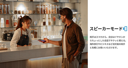二つ目はスピーカーモードで自分はイヤホンを着け、相手は差し出されたスマホに向かって話す形式。旅行でのちょっとした会話など、相手にイヤホンを渡す必要がないので便利だ。