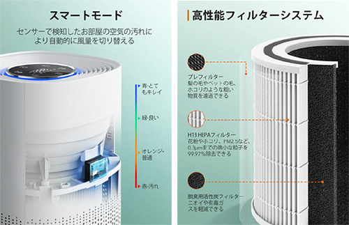 三層の高性能フィルターは0.3μmの微粒子の99.97%を捕捉し、微粒子まで取り除いた綺麗な空気を流れさせ、ペットを飼っている人、新生児のいる親、敏感な鼻/喉の患者などに最適となっている。また、花粉やほこりなどからバクテリアなどを含めたウイルスまで、あらゆる物質に対応。部屋をまるごと綺麗にし、より健康的に暮らせる環境を実現する。