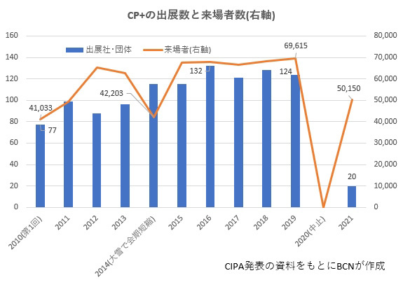 近年の縮小著しいカメラ市場でも、CP+の来場者数は善戦してきた。最後にリアルで開催されたCP+2019では、4日間の会期中6万9615人が来場。前年比微増で過去最多を記録した。しかし今年は5万150人。前回比で28.0%減だ。2012年以来、大雪で1日休んだ14年を除いて、ずっと6万人超えを続けてきたが、今年は5万人台にとどまってしまった。この変化をどう評価すべきか。