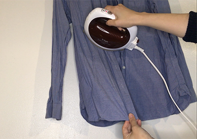 シャツやジャケットなどは、引っ張りながらかけるとスチームがよくあたってシワが伸びる。本体の傾きによっては、水タンクから水が供給されないこともあるため、持ち方には若干の注意が必要だ。説明書によると、本体の先端を時計の10時から2時の角度で使うといいという。