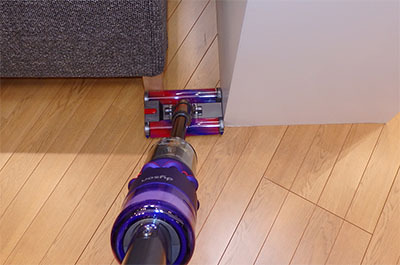 例えば、ソファの後ろなど正面幅208ミリ以上だとひっかかってしまうところも、手首をひねってヘッド部を回転させれば、難なく掃除することができる。