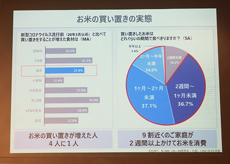 パナソニックでは、コロナ禍で家庭における米の買い置きが増えている点に着目。約9割の家庭で、2週間以上かけて米を消費している実態が分かったという。買い置きして時間がたつと課題になるのが、米の乾燥だ。同社の調べによると、精米直後の米は含水率14%だが、2週間後には12%まで下がってしまう。