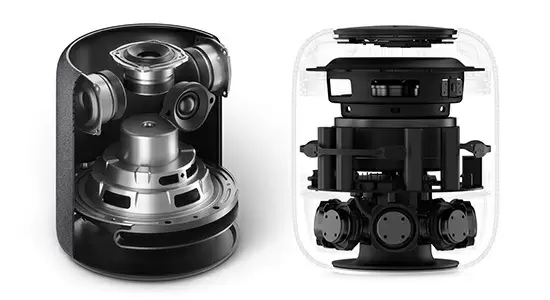 まず理由として挙げられるのは、そのコスパの良さだ。写真で見れば一目瞭然だが、HomePodは外側から想像がつかないほど複雑な機構におり、それだけでも考えられたオーディオ機器だと分かる。下記にて比較しているAmazon Echo Studioでは、複数のスピーカーが搭載されているものの、構造としてはシンプルで平凡な印象。対してHomePodは、ウーファーが上部に上向きで配置されていたり、専用設計のツイーターが内向きに配置されていたりと斬新な構造を採用している。