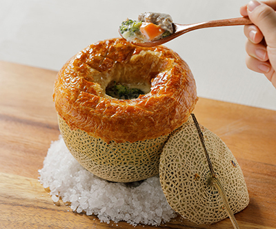THE COURTYARD KITCHEN(ザ・コートヤードキッチン)では、松本一平シェフ監修によるメニューなどをコースで楽しめる「nicoe“静岡クラウンメロン”プチコース」、アマゾンの料理人である太田哲雄シェフが監修した「丸ごと静岡クラウンメロンとカマンベールのブリオッシュポットパイ」、江森宏之シェフ監修の「静岡クラウンメロンのヴェリーヌ」などを用意している。
