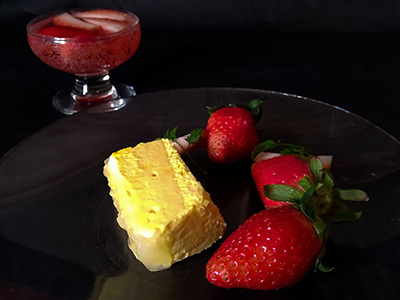 “スパイスの女王”とも呼ばれ、栄養成分が豊富なサフランをふんだんに使用することで、エキゾチックな朱色と魅惑的な味・香りを体験でき、洋梨をトッピングすることによって洋梨の持つ上品な酸味が味のコントラストを表現し、絶妙なバランスに仕上げている。