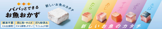 パパっとできるお魚おかずは、5種類の魚の骨を取り除いてキューブ状(約15g)にカットすることで、おいしさと簡便さの両立を目指した。これまで一切れ単位で調理していた魚を少量から使えるため、弁当にも入れやすく、子どもも食べやすい形状となっている。まわりに打ち粉を施すことで、下ごしらえの手間が省け、冷凍のまま調理しても調味料が絡みやすいことに加え、魚の旨みや水分を逃しにくく、加熱後も食感を保つ。