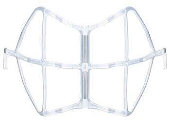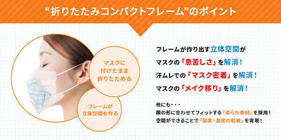 立体インナーマスク 折りたたみコンパクトフレームは、不織布マスクに取り付けたまま折りたたむことができる。超軽量でコンパクトな設計によって、マスク着用時の暑さや蒸れ、息苦しさ、メイク移りなどの不快感を解消する。マスクにフックで引っ掛けるだけの簡単装着。柔軟性が高い素材のため、不織布マスクの構造が多少異なっても安定した付け心地を実現している。洗って何度も使える樹脂素材を使用している。