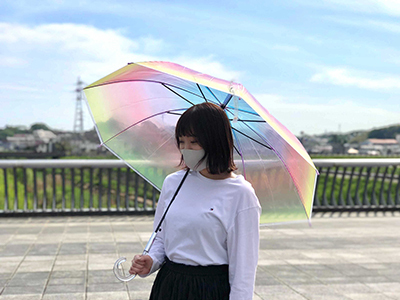オーロラ傘は、まるでオーロラのようなグラデーション色に仕上げたビニール傘。太陽の光越しに見える、足元の自分自身と傘の影も美しく映る。