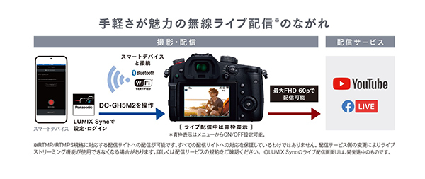 無線ライブ配信機能を搭載では、高速通信に対応したスマートデバイスとテザリング接続することで、専用アプリ「LUMIX Sync」を使って手軽にライブ配信を楽しむことができる。