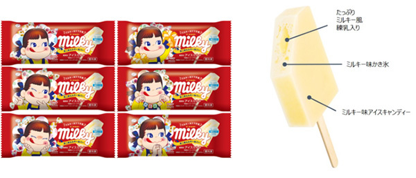 「不二家ミルキー氷バー」は、ミルキー味アイスキャンディーの中にミルキー味かき氷とミルキー風練乳をたっぷりと入れ、さっぱりとしつつも、ミルキー特有のやさしいミルクの美味しさを楽しめるバータイプのアイスとなっている。
