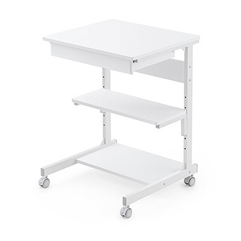 「100-DESKF037W」は、幅55.0cm、奥行き51.5cmの、スリムで圧迫感のないPCラック。コンパクトでリビングの隅やワンルームに設置しても邪魔にならず、さまざまなアイテムの収納に便利な引き出しと、5段階の高さ調整に対応した移動棚を備えている。