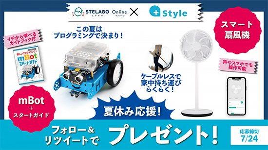 キャンペーンでは、予約受け付けを開始した「mBot スタートガイドセット」に加え、+Styleの人気スマート家電「スマート扇風機」をセットで1人にプレゼントする。スマート扇風機は、アプリ「+Style」で操作可能なスマート家電で、スマートスピーカーによる音声コントロールにも対応している。キャンペーンへの参加には、7月24日の23時59分までに当該ツイートをリツイートし、@plusstylejpと@OnlineStelaboとをフォローする必要がある。