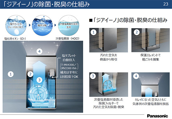 ここで、ジアイーノの除菌・脱臭の仕組みをおさらいしよう。ジアイーノは塩タブレットをトレーの水に注入して、電気分解することで次亜塩素酸水溶液を生成する。F-MV4300とF-MV2300では、塩タブレットが自動投入されるので、補充は半年に1回程度でよくなった。