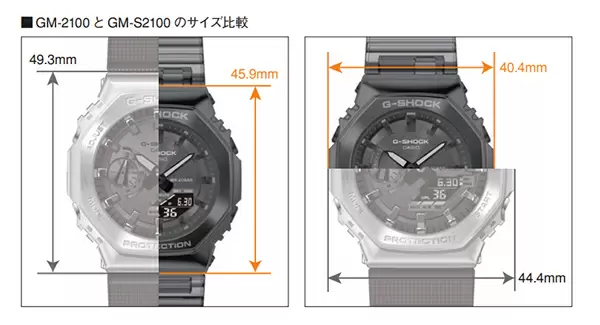 よりコンパクトな、ベゼルカバー部分に硬質なステンレス素材を採用した、メタル外装ミニマルデザインの「GM-S2100」も発売する。価格はブラックの「GM-S2100B-8AJF」、華やかなローズゴールドの「GM-S2100PG-1A4JF」ともに2万6400円、「GM-S2100-3AJF」が2万4200円。