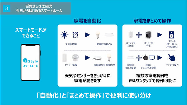 +Styleユーザーへのアンケートによると、IoTデバイスの使い方としてもっとも高いのは「スケジュール」。次いで、スマートスピーカー操作、GPSとなっている。近藤社長は「+Styleのスマートモードを使えば、天気やセンサーをきっかけに動かしたり、他の家電操作と連携した操作を行ったりということもできる」と新たな使い方を提案した。