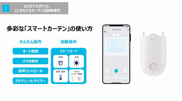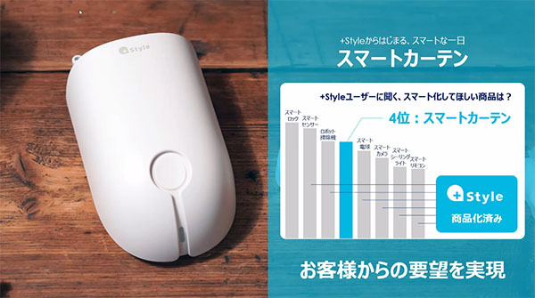 数多くのIoT家電をラインアップする+Styleオリジナル家電の新製品は、自社ブランドとしては初となるカーテンを自動で開閉するスマートデバイス。同社の近藤正充社長によると「ユーザーからの要望がとても高く、スマート化してほしい商品に関する調査では上位に入っている」という。