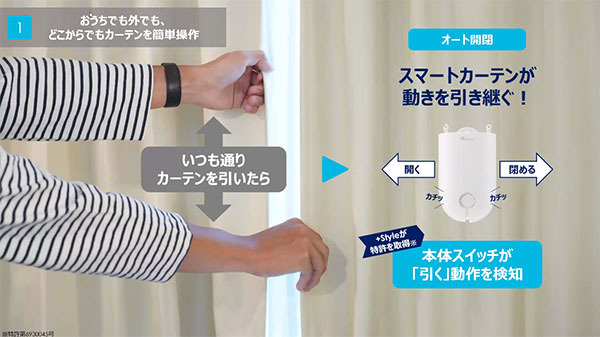 多くの住宅に採用されているC型・I型・O型のカーテンレールに対応。工事不要で簡単に取り付けることができる。特徴的なのは特許を取得した独自機能「オート開閉」だ。手でカーテンを動かしたい方向に軽く引くと、カーテンが自動で引かれた方向に開閉する。