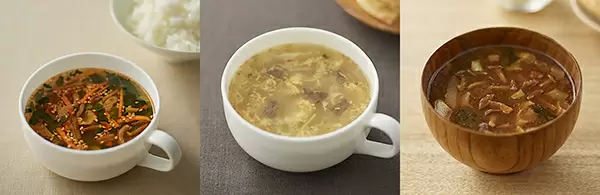(左から)食べるスープ ユッケジャンスープ、同コムタンスープ、同なめこの赤だし