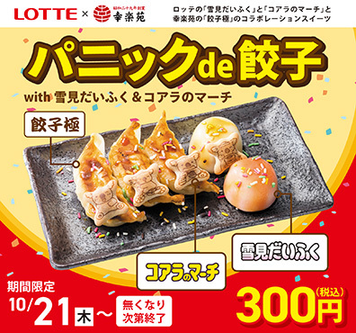 幸楽苑ホールディングスは、10月21日からの期間限定で、ロッテとコラボレーションした新商品「パニックde餃子with雪見だいふく&コアラのマーチ」を販売する。