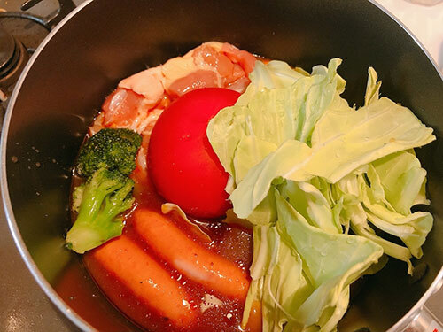 作り方は簡単。スープの素と水200ml、好みの材料を入れて煮込むだけ。今回はトマト、鶏肉、キャベツ、ブロッコリー、ウインナーを入れてみた。開封から出来上がりまで終始ガーリックとトマトの香りが漂い、食べる前から旨味が伝わってくるようだ。