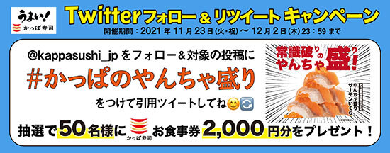 なお、「やんちゃ盛り サーモンいくら」Twitterキャンペーンを12月2日23時59分まで実施する。かっぱ寿司公式Twitterアカウントをフォローし、対象のキャンペーンツイート(投稿)に「#かっぱのやんちゃ盛り」をつけて引用ツイート。引用ツイートした人の中から、抽選でかっぱ寿司お食事券2000円分を50人にプレゼントする。