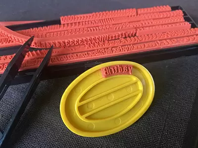 そしていよいよ文字列が全て連なっているゴム板から、必要な文字を切り出す。これは人それぞれだろうが、メッセージの最初の文字から適当に入れると中心がずれそうなので、真ん中の文字を最初に中央に据えてから左右交互に入れていった。