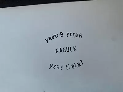 そしてスタンプ台でインクをつけて白い封筒の中央に、はいポン! さあ、どうでしょう!とテンションを上げて見てみると、なんだこれは!文字の順番がすべて逆になっている。ハンコだから逆になることはわかっていたつもりだが…。